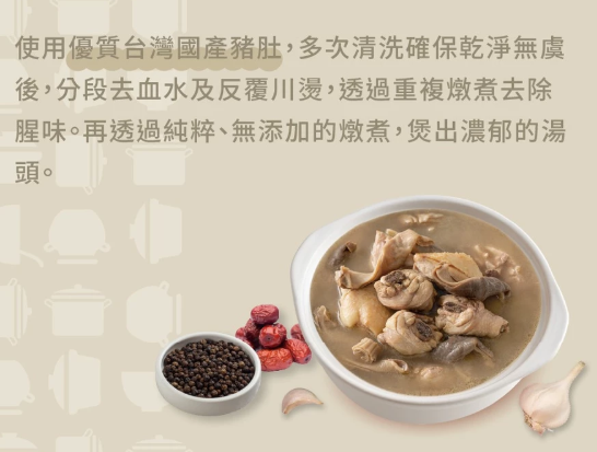 • 使用優質台灣國產豬肚,並經過多段燉煮或川燙熟切條狀的處理